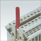 | 安裝軌(詳見P24)終端固定件 適用于TH35/7.5 型和G 32型標(biāo)準(zhǔn)安裝軌,起端子排兩端的定位作用。 | 試驗(yàn)插頭 由Φ2.3和 2.4兩個(gè)規(guī)格和與之相對(duì)應(yīng)的(裝在端子導(dǎo)電件中心螺孔上)測(cè)試插座形成的測(cè)試連接,可檢測(cè)接線端子排在運(yùn)行時(shí)的各類電氣參數(shù)。試驗(yàn)插頭手柄有八種顏色可供選用。 | 標(biāo)記條 主要用于標(biāo)識(shí)各端子在接線端子排中的順序位置或?qū)?yīng)電路中導(dǎo)線連接點(diǎn)的標(biāo)志。每條10位,能橫(豎)向打印數(shù)碼和字母或其它標(biāo)識(shí)內(nèi)容,可在端子組裝成排后快速安裝在上部兩端的標(biāo)記槽內(nèi)。 | 絕緣隔片 用于相鄰聯(lián)絡(luò)端子組的分組和電氣隔離。所有聯(lián)絡(luò)端子組的兩端必須加裝絕緣隔片,可在接線端子組裝后再插入,不會(huì)影響整體空間。 |