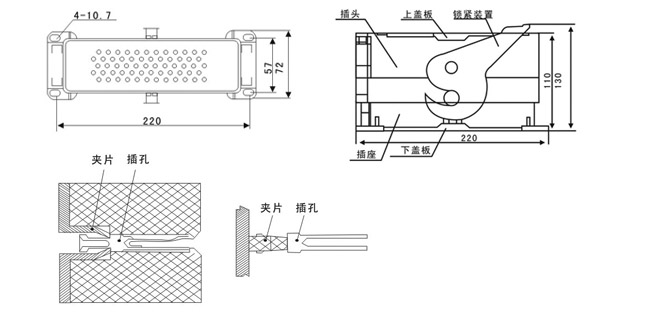 GDZ-58G型二次插頭座(改進型)的接觸對為插針、插孔式結構,接觸對數為58對,可自行選擇接觸對的使用數量。接線方式:打開插頭座的鎖緊裝置,把插頭與插座分開,分別取下蓋板,把導線放入插針和插孔的接線孔內,用專用夾鉗夾緊牢固的,把插針和插孔分別放入插頭和插座基座對應的碟形安裝孔內,(插針 插孔放入插頭座固定之后,由插頭及插座基座內部的雙面夾片固定。)聽到“啪”響,表示已安裝到位;將線束從引線品引出后配上專用附件M36×8塑料軟管(內襯覆塑金屬彈簧),再用蓋板分別固定在插頭和插座基座上,另一頭線束用專用拐頭固定在設備上。本廠配置四孔特殊固定彎頭。